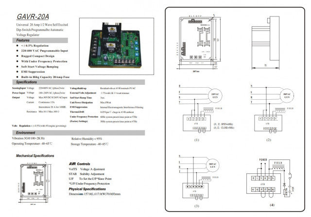 AVR генератор model 20 Ампера Технически спецификации: Model: GAVR-20A Input: 220V/400VAC Output 170-270vac Magnetic field output: maximum 95VDC - 240VAC input,...